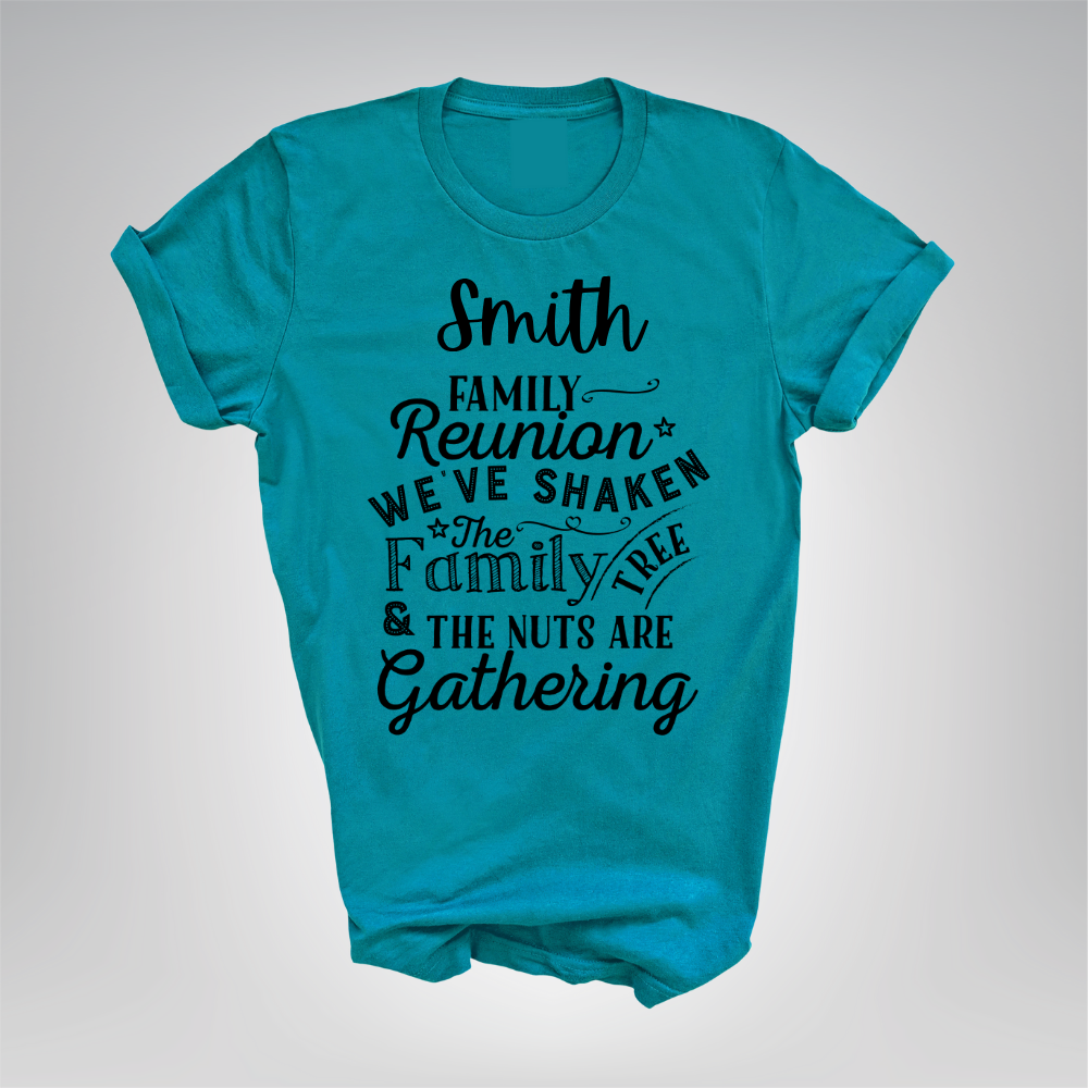 Celebrate your family reunion in style with this playful adult t-shirt! Personalize it with your family name alongside the funny quote, "We've shaken the family tree and the nuts are gathering." Perfect for bringing laughs and a sense of togetherness to your special gathering. Comfortable and fun, it’s a great way to show off your family pride and create lasting memories.