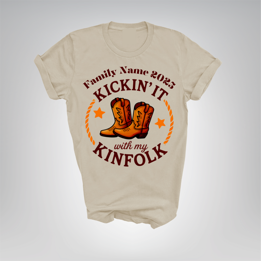 Kick back and celebrate your family reunion with the Kickin It With Kinfolk Family Reunion Adult T-Shirt! Featuring a fun design with cowboy boots front and center and the phrase "Kickin It With My Kinfolk," this shirt adds a playful western flair to your gathering. Customize it with your family name and reunion year to make it uniquely yours and create lasting memories in style.
