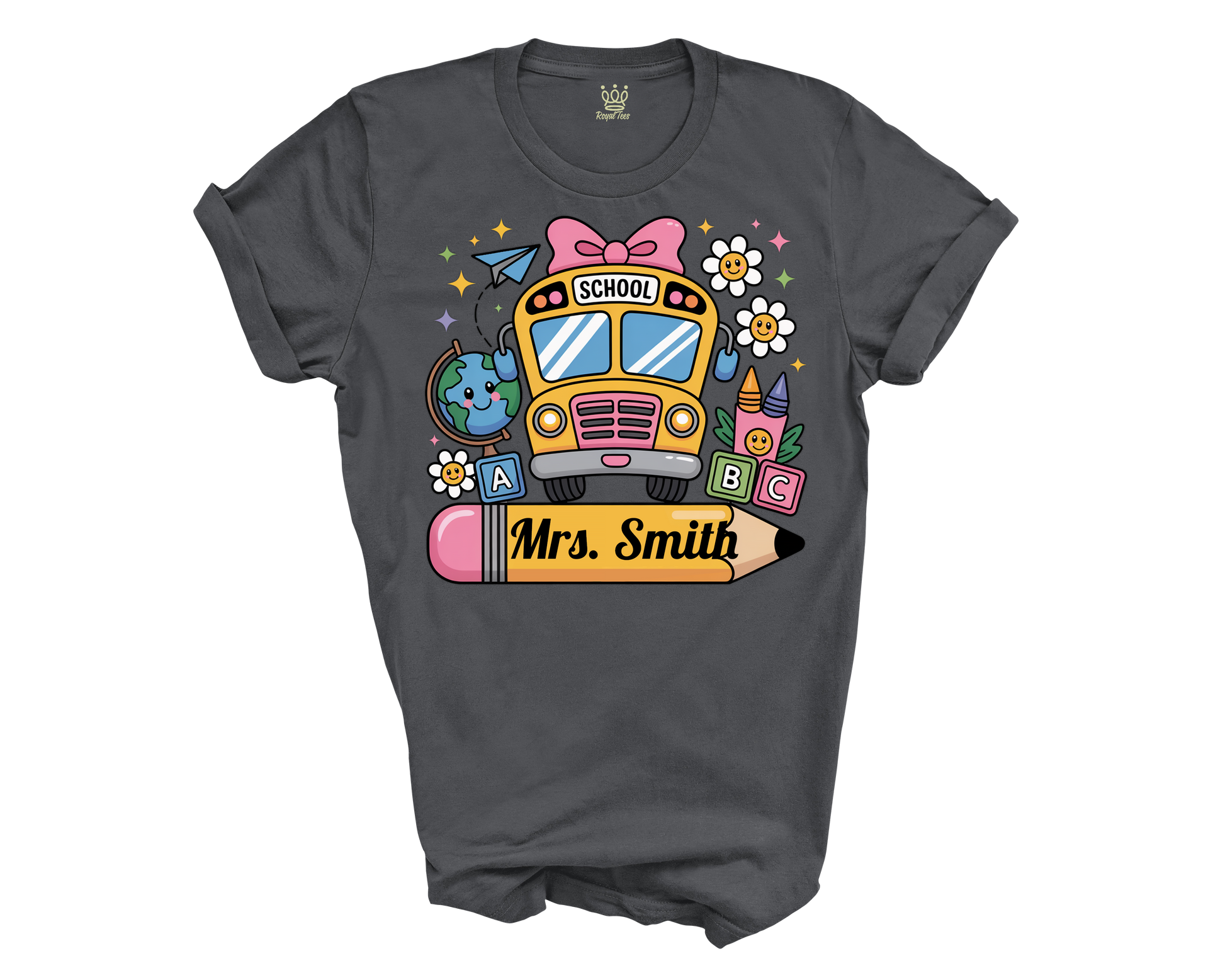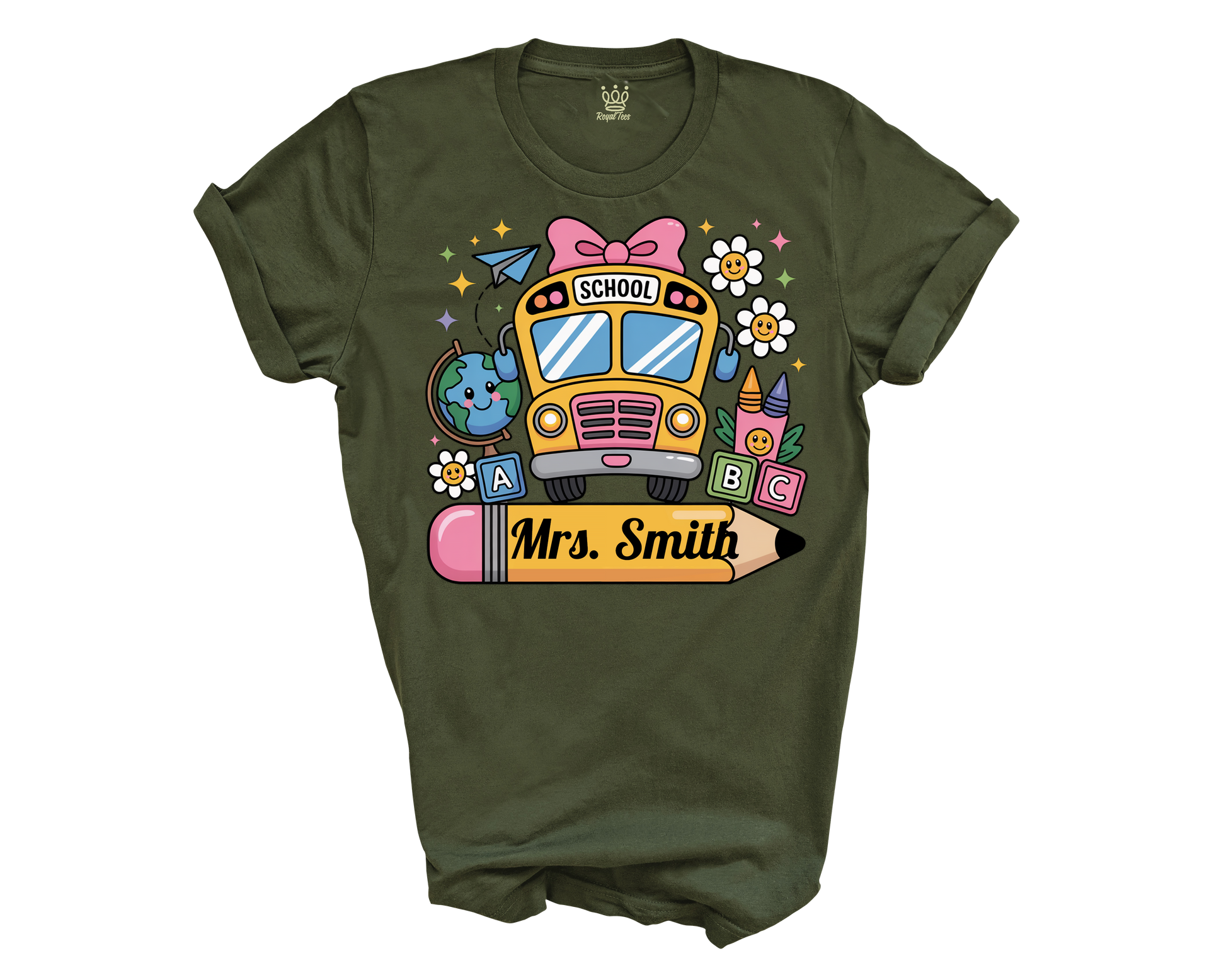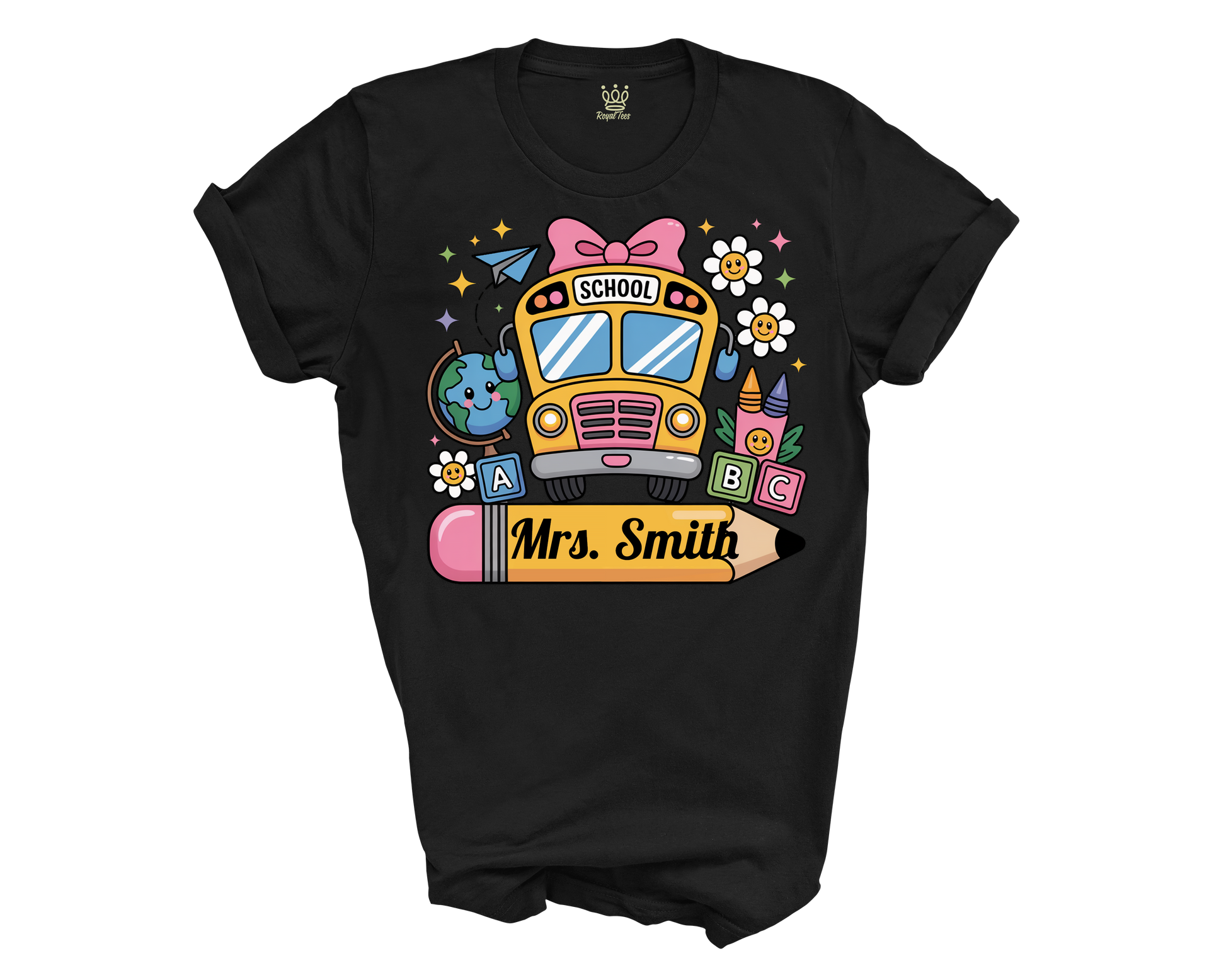 Designed with love, this colorful shirt features an adorable school bus, ABC blocks, globe, flowers, and a giant pencil personalized with your name – perfect for teachers, aides, and staff.