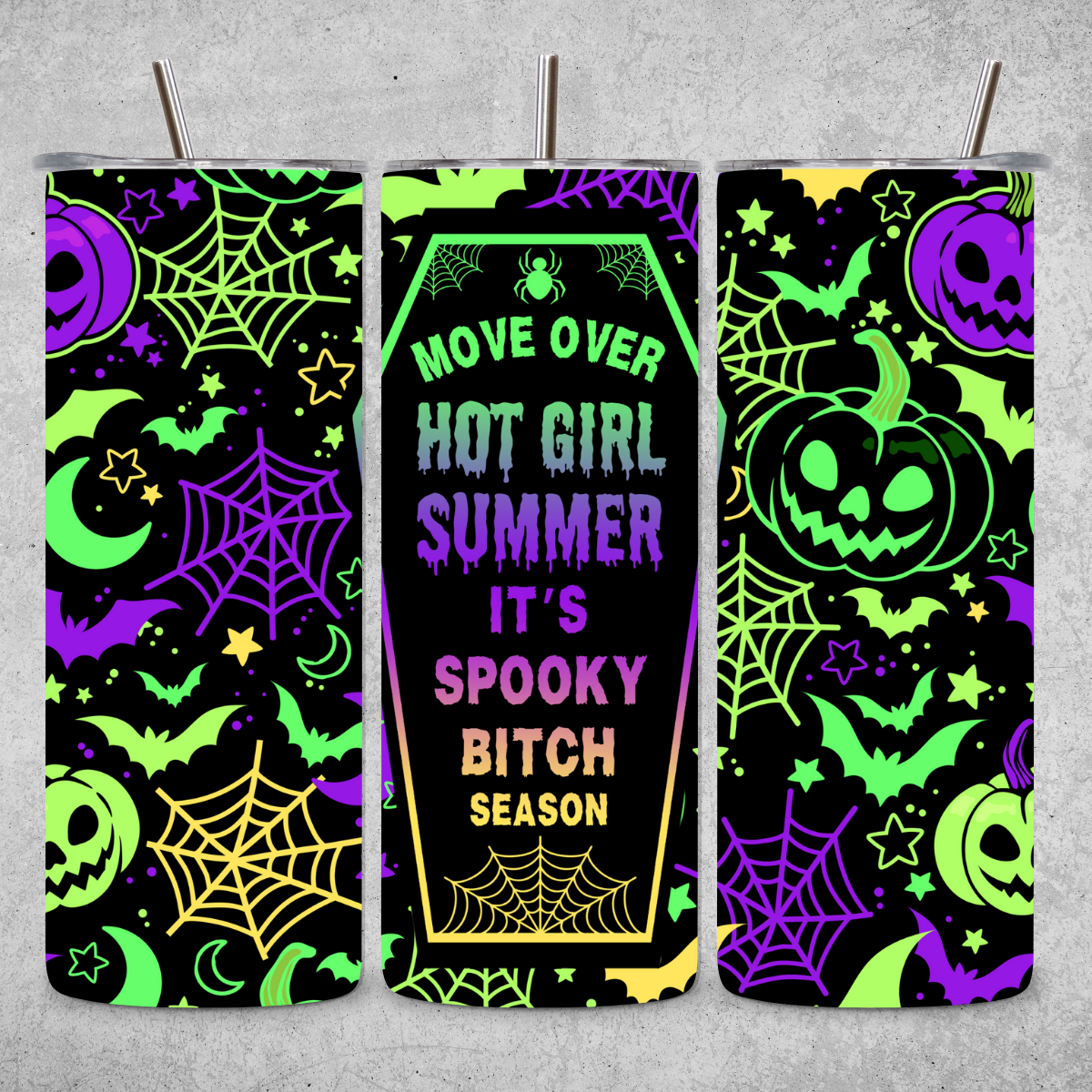 🔥 Best Seller! 🔥 Step aside summer — it’s officially Spooky Bitch Season! This bold and sassy 20oz stainless steel tumbler is perfect for keeping your drinks icy cold for up to 12 hours or piping hot for up to 8 hours. Featuring a coffin-shaped center design with neon lettering — “Move Over Hot Girl Summer, It’s Spooky Bitch Season” — surrounded by glowing jack-o’-lanterns, spider webs, stars, and moons in vivid green, purple, and yellow. The double-wall insulation ensures maximum temperature retention, while the included spill-resistant lid and reusable straw make it perfect for on-the-go sipping. Whether you’re at the pumpkin patch, heading to a Halloween party, or living your best witchy life, this tumbler is the ultimate accessory for spooky season lovers with attitude.