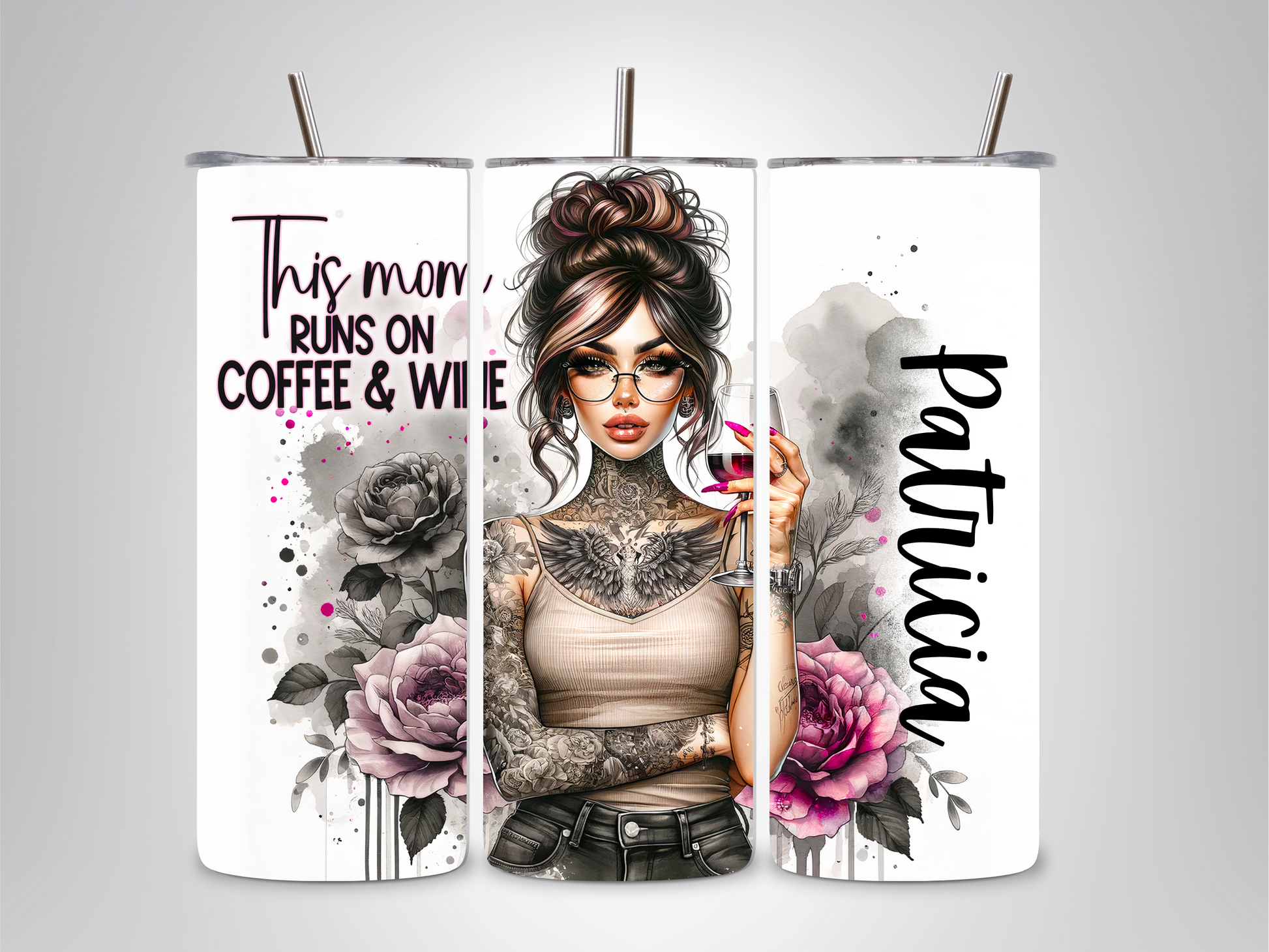 This 20 oz tumbler showcases a stylish design of a woman holding wine alongside the witty quote, "This mom runs on coffee and wine." Option for additional fee to make Customizable with a name, it makes a thoughtful and personalized gift. Crafted for everyday use, it keeps drinks at the perfect temperature while celebrating the multitasking spirit of moms who balance coffee and wine with ease. Durable and practical, it’s ideal for home, work, or on the go.